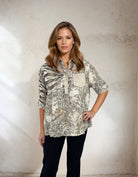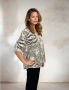 Tyylikäs pusero 100 % viskoosia suutarin kaulus ja pyöreä pääntie. Napit menevät rintaan asti ja ne on peitetty kimaltelevalla, yhteensopivalla kankaalla – sama hieno yksityiskohta kuin rintataskussa. Tämä antaa puserolle ainutlaatuisen ja hyvin tehdyn ilmeen. Malli on takaa pidempi kuin edestä ja siinä on hihat, jotka voidaan taittaa alas pidempään istuvuutta varten, mikä tekee siitä sekä käytännöllisen että monipuolisen.