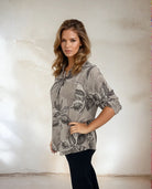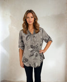 Tyylikäs pusero 100 % viskoosia suutarin kaulus ja pyöreä pääntie. Napit menevät rintaan asti ja ne on peitetty kimaltelevalla, yhteensopivalla kankaalla – sama hieno yksityiskohta kuin rintataskussa. Tämä antaa puserolle ainutlaatuisen ja hyvin tehdyn ilmeen. Malli on takaa pidempi kuin edestä ja siinä on hihat, jotka voidaan taittaa alas pidempään istuvuutta varten, mikä tekee siitä sekä käytännöllisen että monipuolisen.