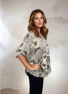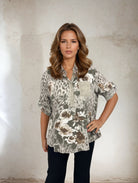 Tyylikäs pusero 100 % viskoosia suutarin kaulus ja pyöreä pääntie. Napit menevät rintaan asti ja ne on peitetty kimaltelevalla, yhteensopivalla kankaalla – sama hieno yksityiskohta kuin rintataskussa. Tämä antaa puserolle ainutlaatuisen ja hyvin tehdyn ilmeen. Malli on takaa pidempi kuin edestä ja siinä on hihat, jotka voidaan taittaa alas pidempään istuvuutta varten, mikä tekee siitä sekä käytännöllisen että monipuolisen.
