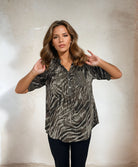 Tyylikäs pusero 100 % viskoosia suutarin kaulus ja pyöreä pääntie. Napit menevät rintaan asti ja ne on peitetty kimaltelevalla, yhteensopivalla kankaalla – sama hieno yksityiskohta kuin rintataskussa. Tämä antaa puserolle ainutlaatuisen ja hyvin tehdyn ilmeen. Malli on takaa pidempi kuin edestä ja siinä on hihat, jotka voidaan taittaa alas pidempään istuvuutta varten, mikä tekee siitä sekä käytännöllisen että monipuolisen.