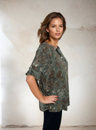 Tyylikäs pusero 100 % viskoosia suutarin kaulus ja pyöreä pääntie. Napit menevät rintaan asti ja ne on peitetty kimaltelevalla, yhteensopivalla kankaalla – sama hieno yksityiskohta kuin rintataskussa. Tämä antaa puserolle ainutlaatuisen ja hyvin tehdyn ilmeen. Malli on takaa pidempi kuin edestä ja siinä on hihat, jotka voidaan taittaa alas pidempään istuvuutta varten, mikä tekee siitä sekä käytännöllisen että monipuolisen.