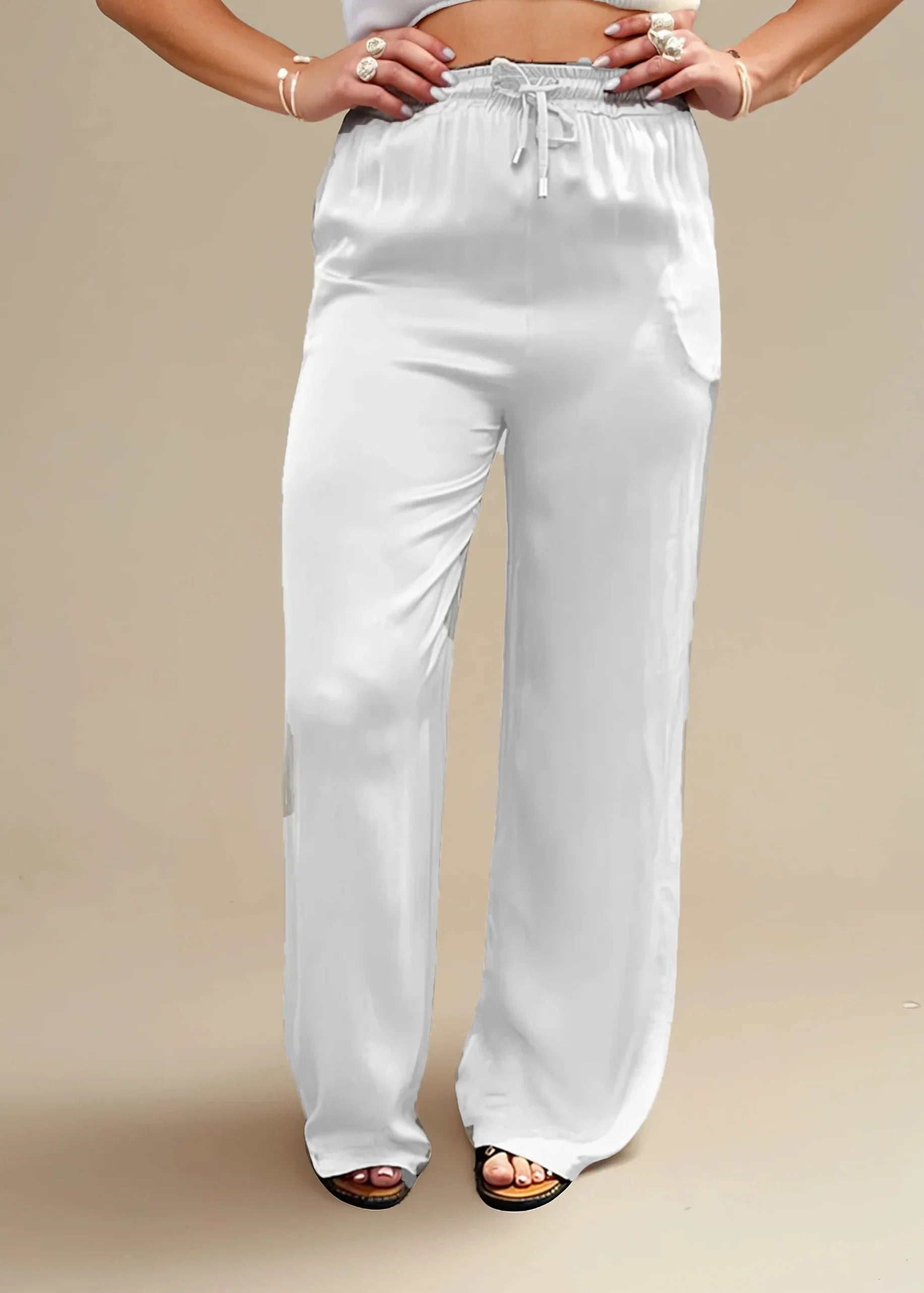 Housut Ylva omasta tuotemerkistämme Mirelle -suunnittelu on lopullinen todiste tyyliä ja mukavuutta tölkki Mene käsi kädessä. Valmistettu 100 % viskoosista silkkisellä, kiiltävällä pinnalla, joka saa sinut tuntemaan ylellisyyttä, vaikka vain käydään ostoksilla (tai makaa sohvalla, emme tuomitse).