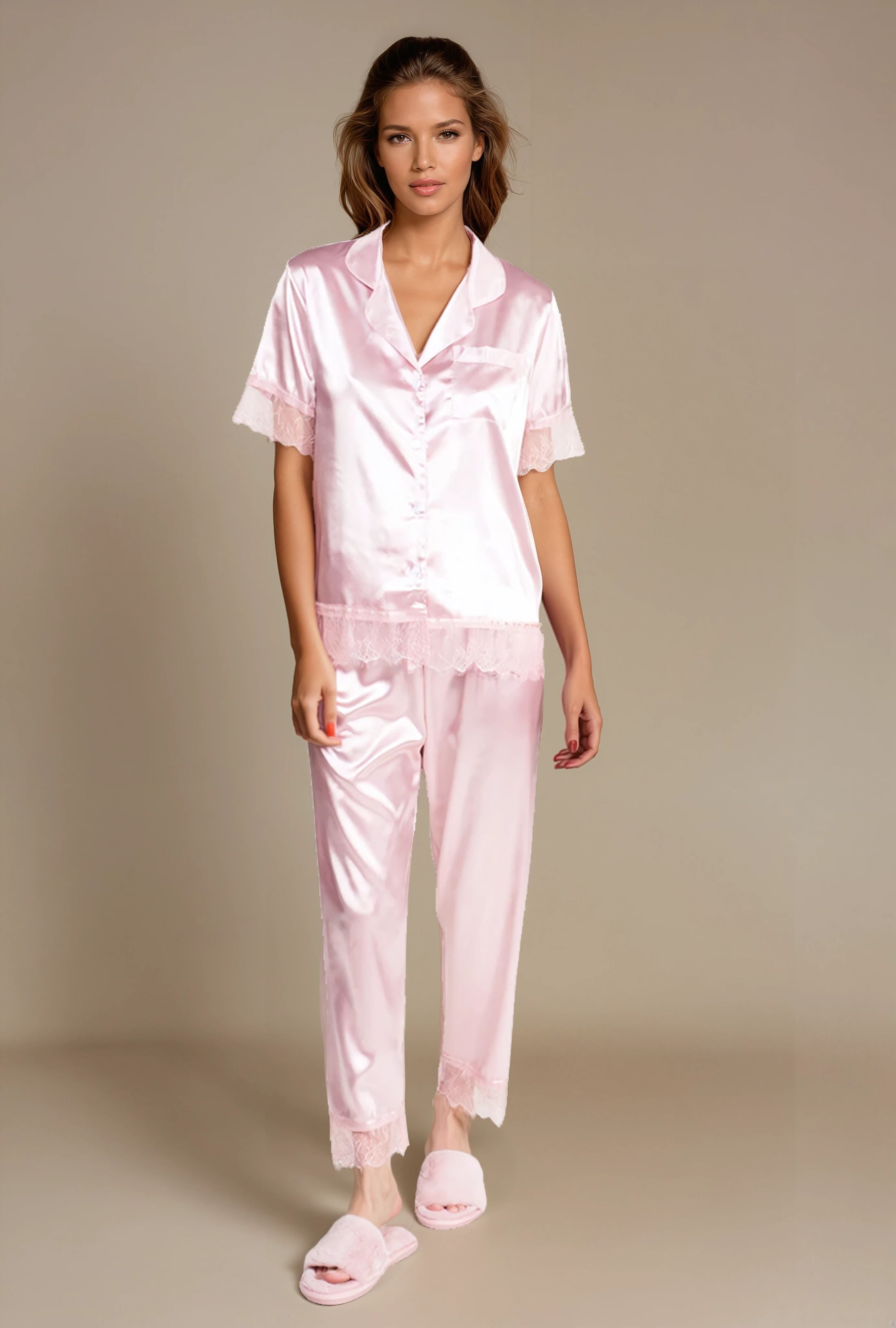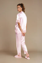Améliorez le style de votre maison avec notre élégant pyjama en satin à manches courtes en 2 pièces – un ensemble en satin féminin et luxueux d’un rose doux et chatoyant. La blouse en satin à manches courtes est associée au pantalon assorti, tous deux ornés de jolis détails en dentelle pour un look sophistiqué et romantique.