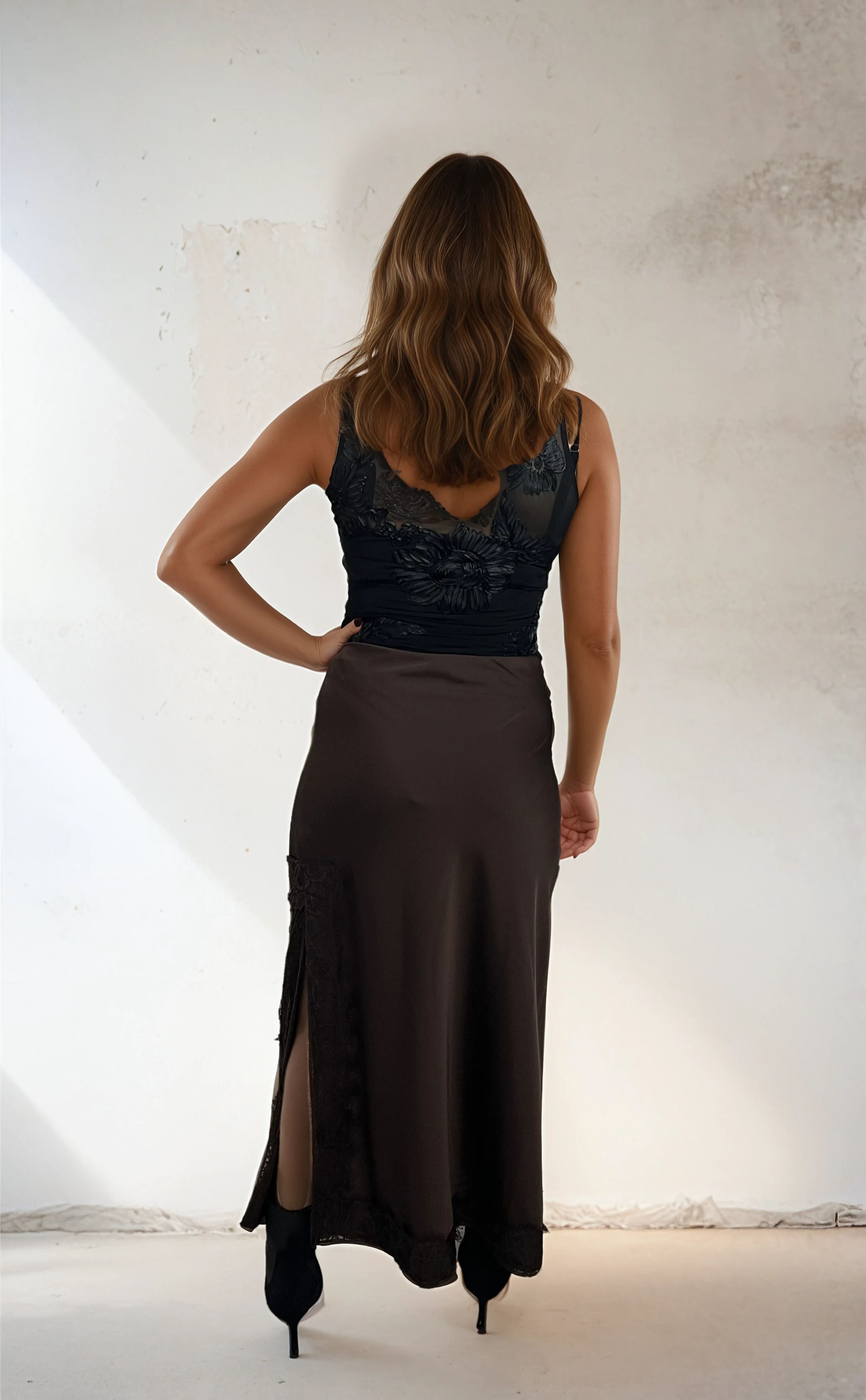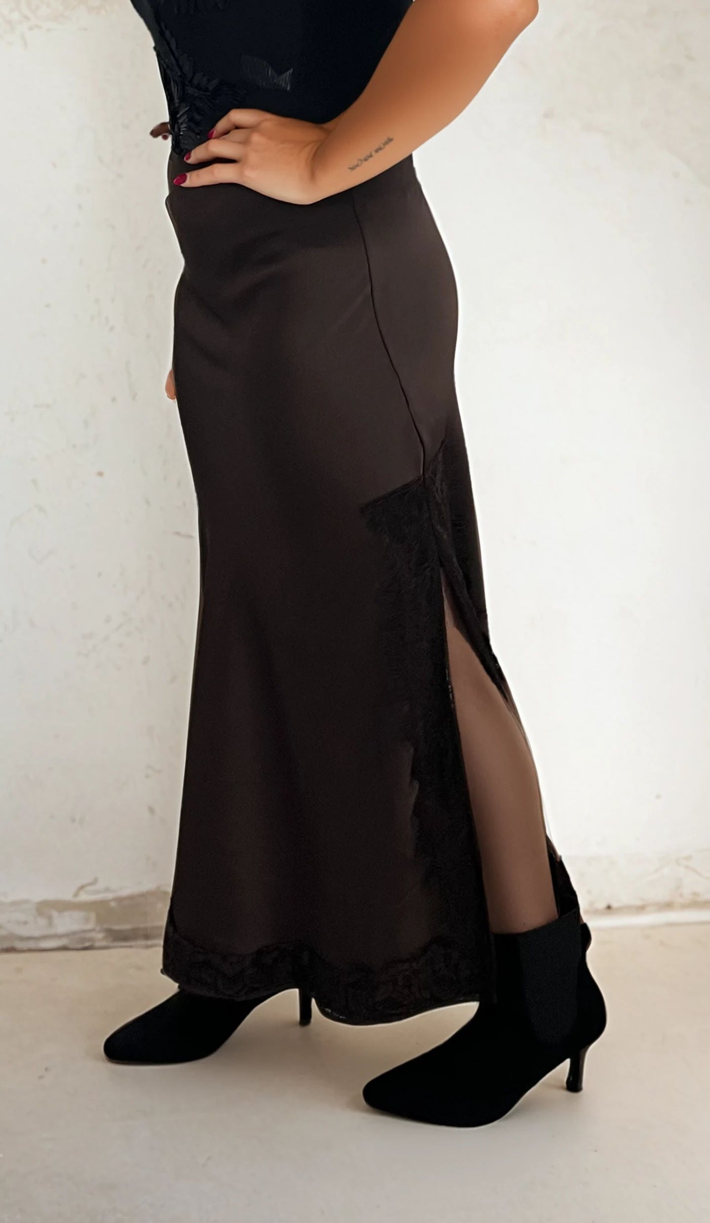 Élégant et féminin – Jupe Isabelle de Mirelle Design combine un toucher satiné doux avec de magnifiques détails en dentelle qui suivent la fente sur le devant. La jupe a une coupe flatteuse avec une forme légèrement droite qui donne un joli tombé et une sensation luxueuse. La surface brillante et le bord en dentelle en bas donnent un look romantique et exclusif - parfait pour les fêtes et les dîners.