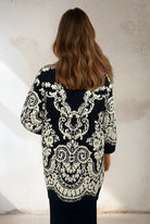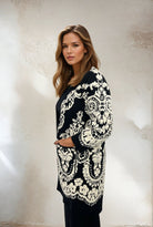 Cardigan Mira est un élégant et accrocheur cardigan tricoté avec un magnifique motif d'inspiration baroque en noir et blanc. Il a une coupe droite et décontractée avec des poches avant et donne une touche luxueuse aux tenues de tous les jours et de fête.