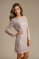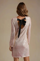 La robe a une coupe droite intemporelle avec des manches longues et une encolure ronde qui équilibre élégamment les paillettes scintillantes. Le dos offre une belle surprise : une découpe profonde dans le dos ornée d'un grand nœud en velours qui donne à la robe une finition exclusive et dramatique.