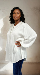 Fabriqué dans un mélange luxueux de rayonne et de viscose, donnant un éclat léger et une belle chute. Les manches longues avec une puissance gonflée discrète et le col ridé ajoutent une touche romantique. Un vêtement polyvalent qui est facilement assorti à la fois avec un jean et une jupe.