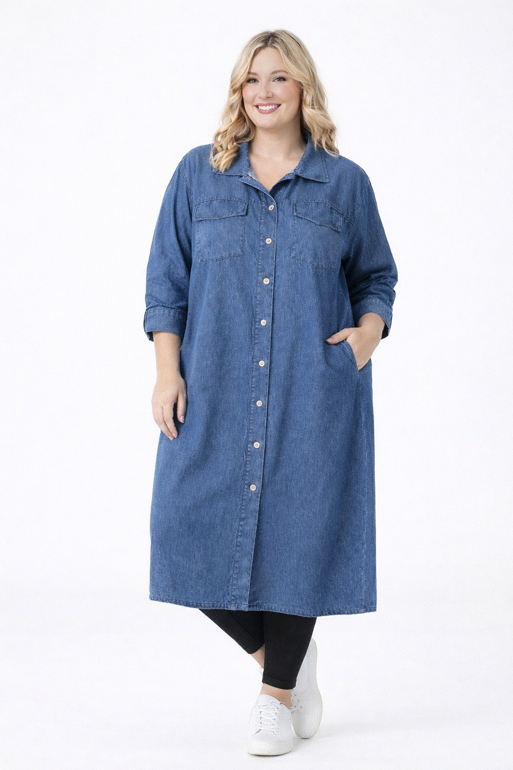 La robe a un col classique, un devant boutonné et des poches poitrine décoratives qui lui confèrent un look intemporel. Le modèle droit, légèrement en forme de A, tombe joliment sur le corps et donne une silhouette flatteuse. Les poches latérales pratiques le rendent à la fois élégant et fonctionnel. Les manches sont 3/4 et peuvent facilement être retroussées pour un look plus décontracté.