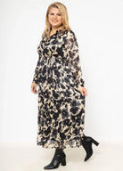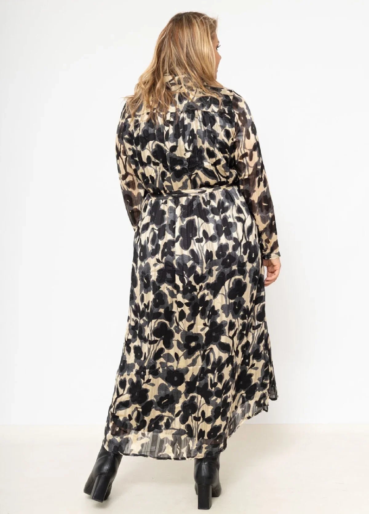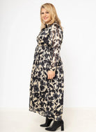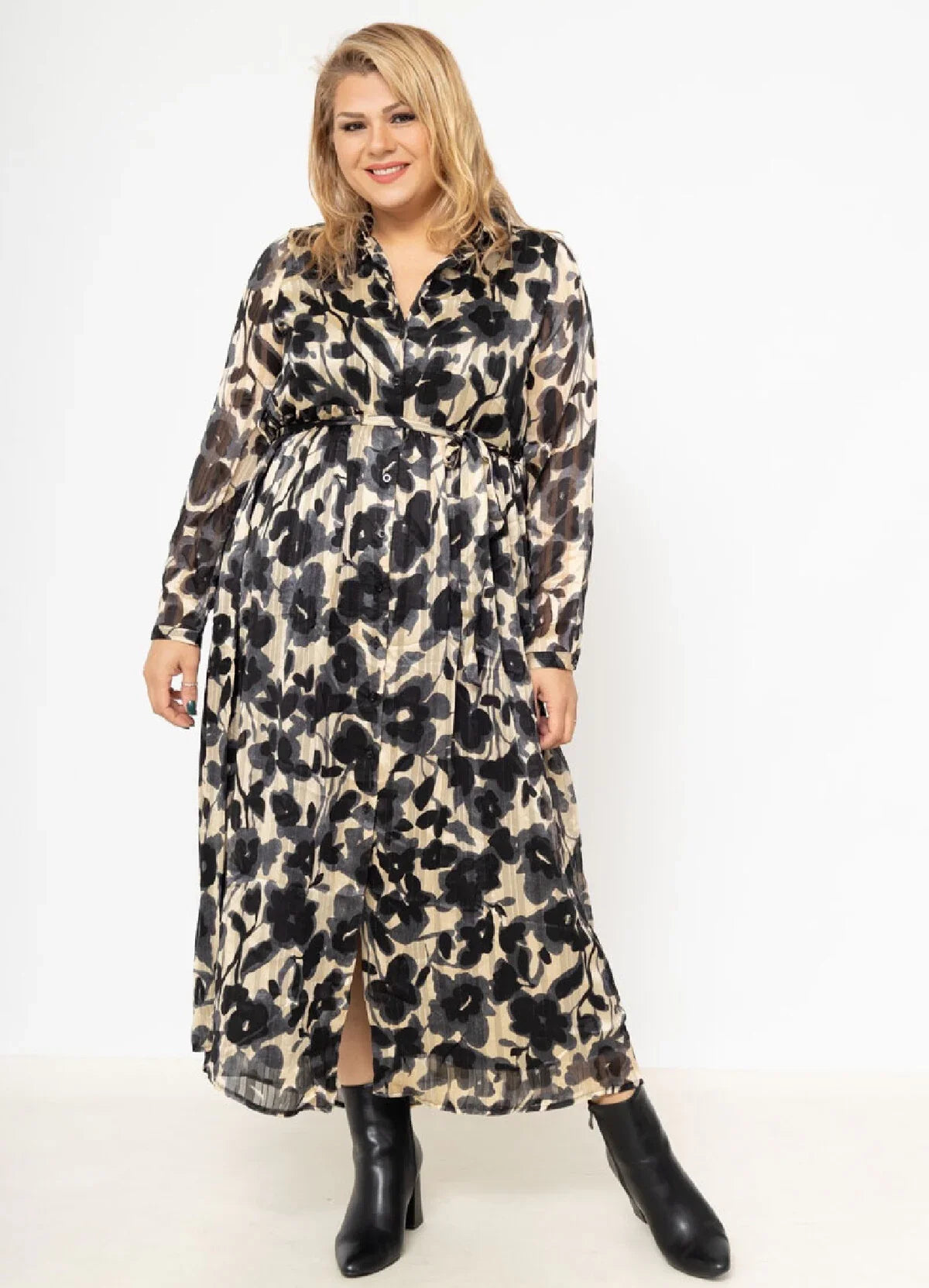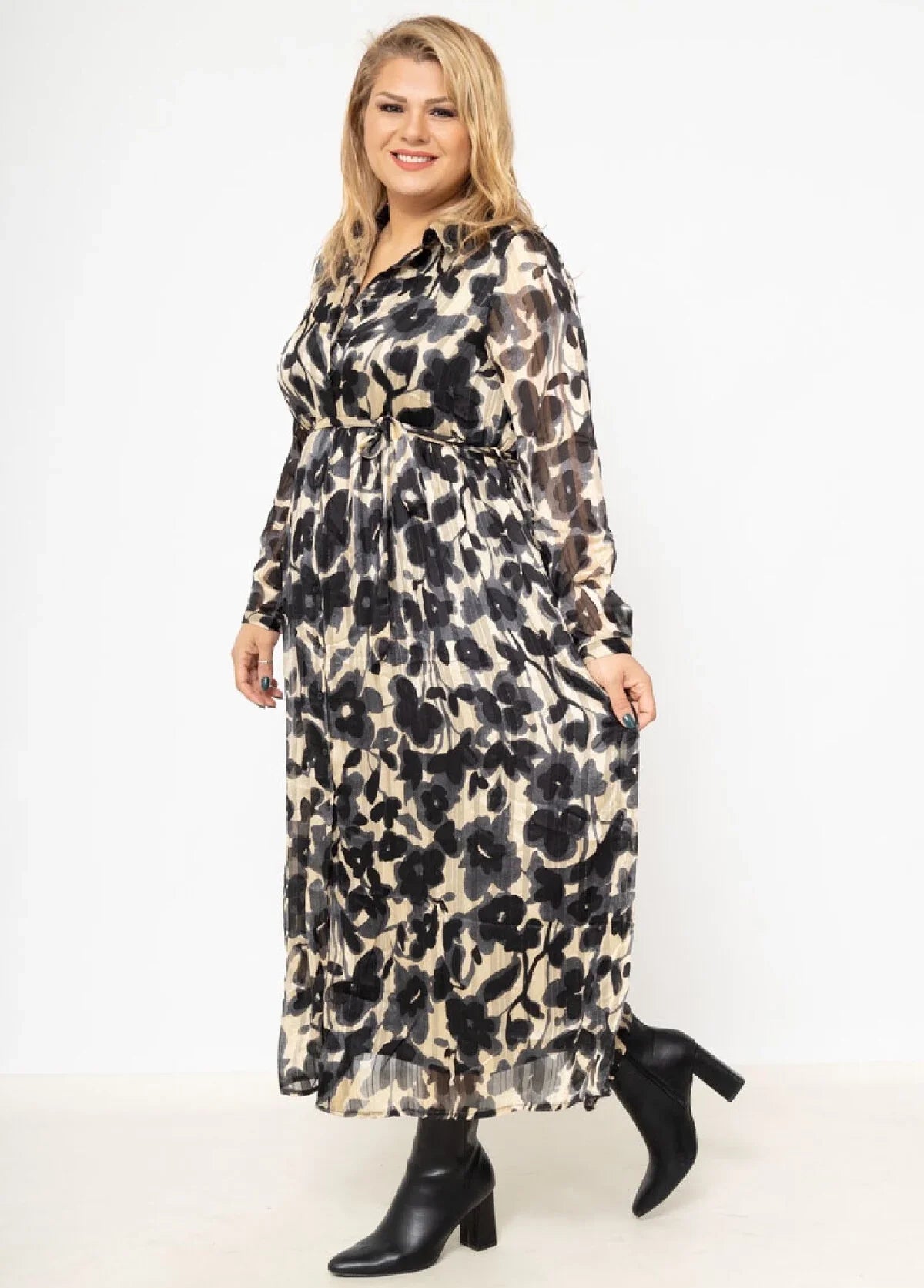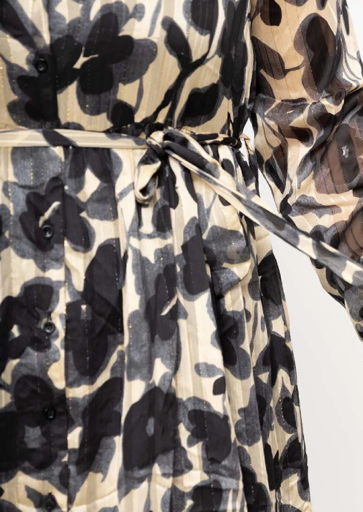 Une robe belle et féminine avec un fond beige et de grandes fleurs en noir. La robe a un col de chemise classique avec des boutons à l'avant et une vie sur le buste et de retour sur les épaules, ce qui donne un bon ajustement. Un groupe sur le côté marque la taille d'une manière flatteuse. La robe est doublée pour une sensation agréable, tandis que les manches non codées donnent une expression légère et élégante.