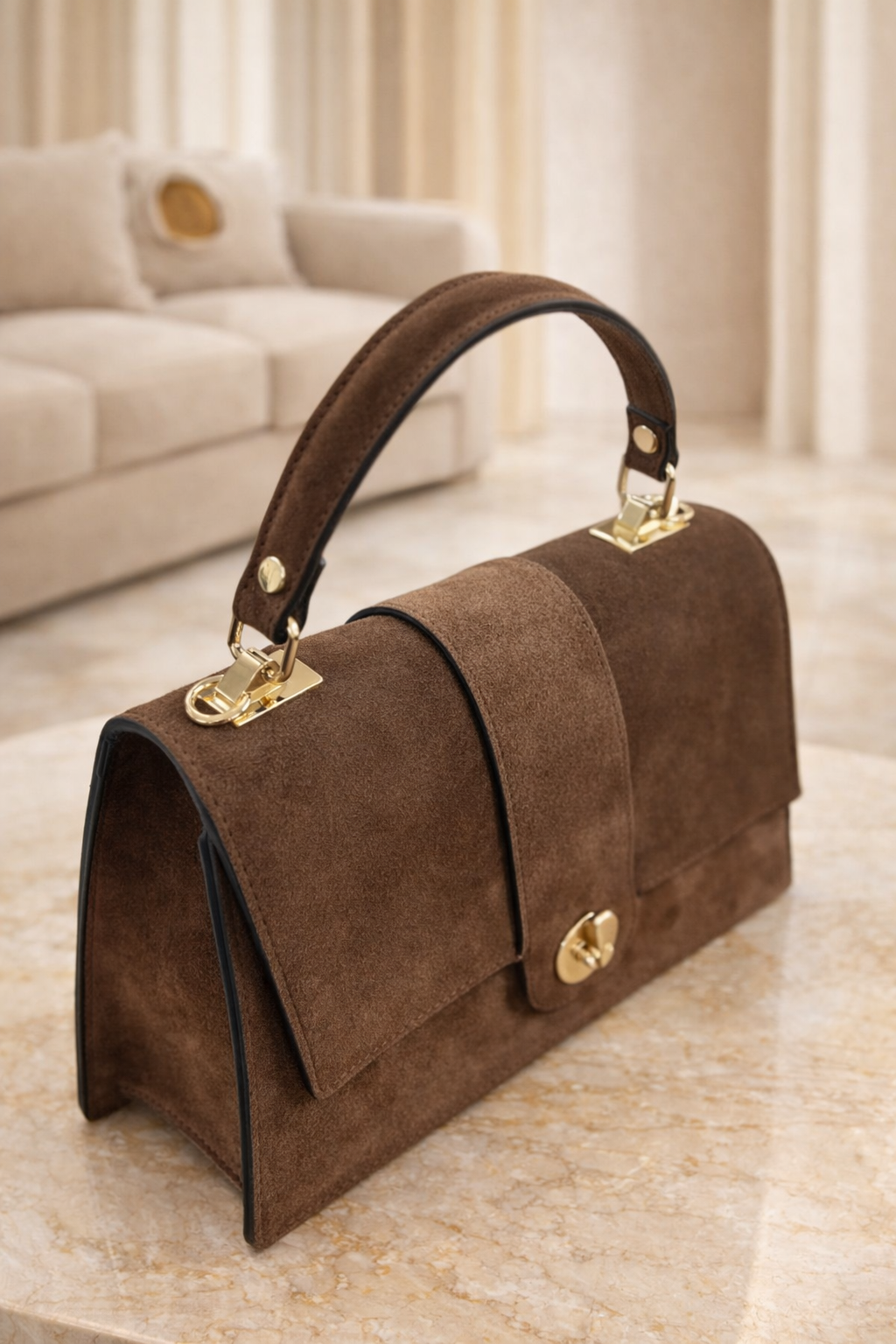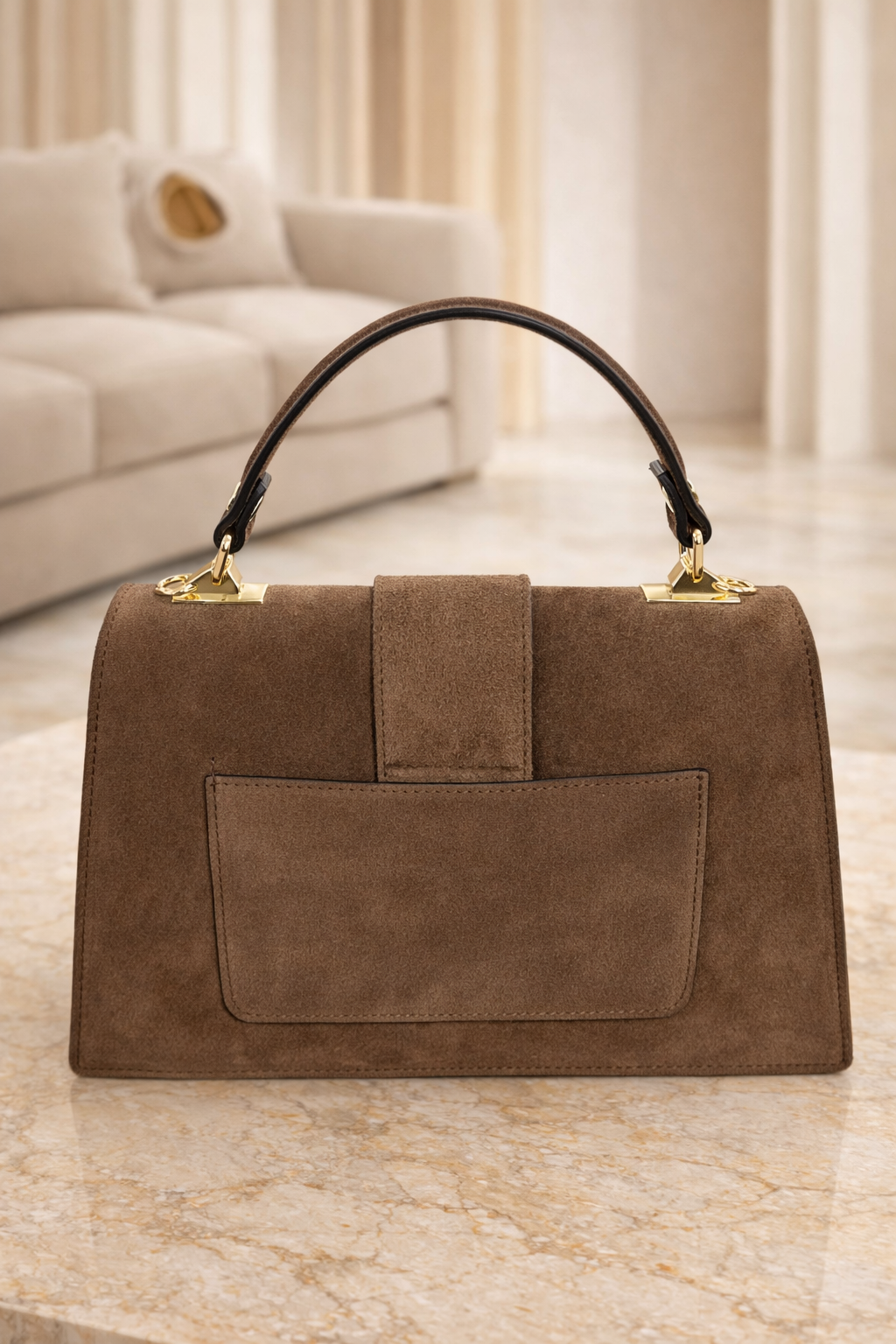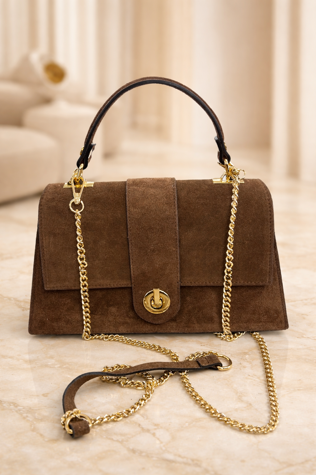 Véritable daim, deux couleurs (café et marron). Le sac possède un compartiment principal ouvert et une petite poche intérieure en daim. Vous pouvez porter le Hedda par la poignée robuste ou utiliser la bandoulière croisée incluse, qui est une combinaison de chaîne et de daim - choisissez vous-même le style qui convient à la journée. Fabriqué en Italie. Marque : Mirelle Design.