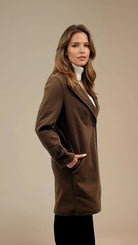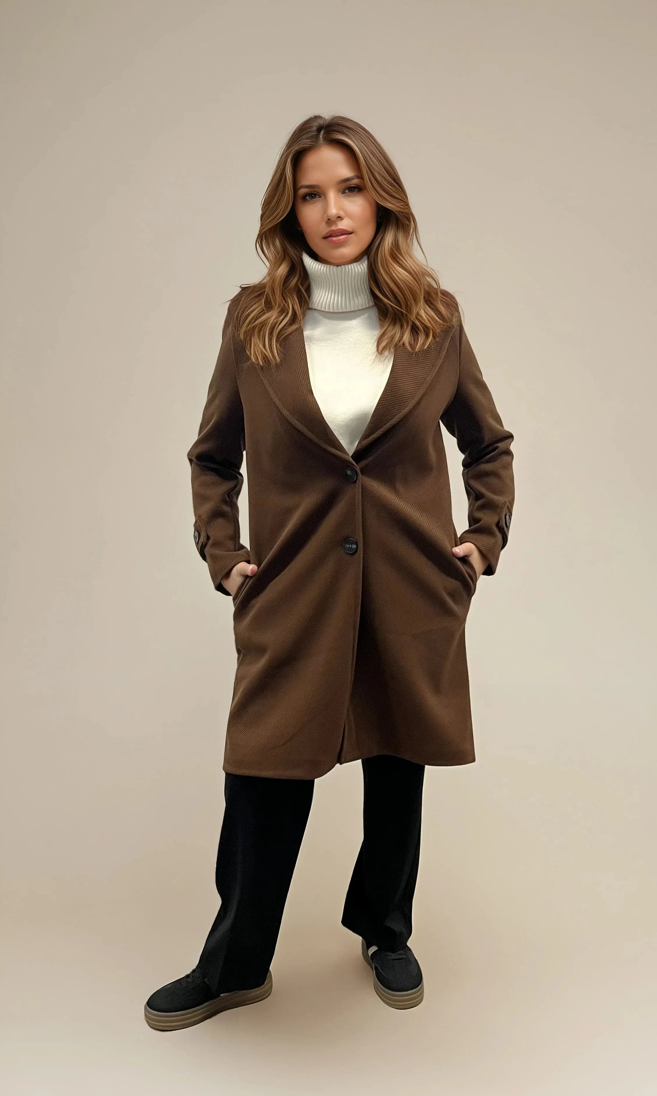 🤎 Kappa Vanessa de Mirelle Design est un manteau de longueur de genou élégant et polyvalent avec un col de veste classique et un bouton simple. Fabriqué en Italie de haute qualité dans un polyester à 95% et à 5% d'élastique pour un bon ajustement et un étirement léger - à la fois confortable et élégant.