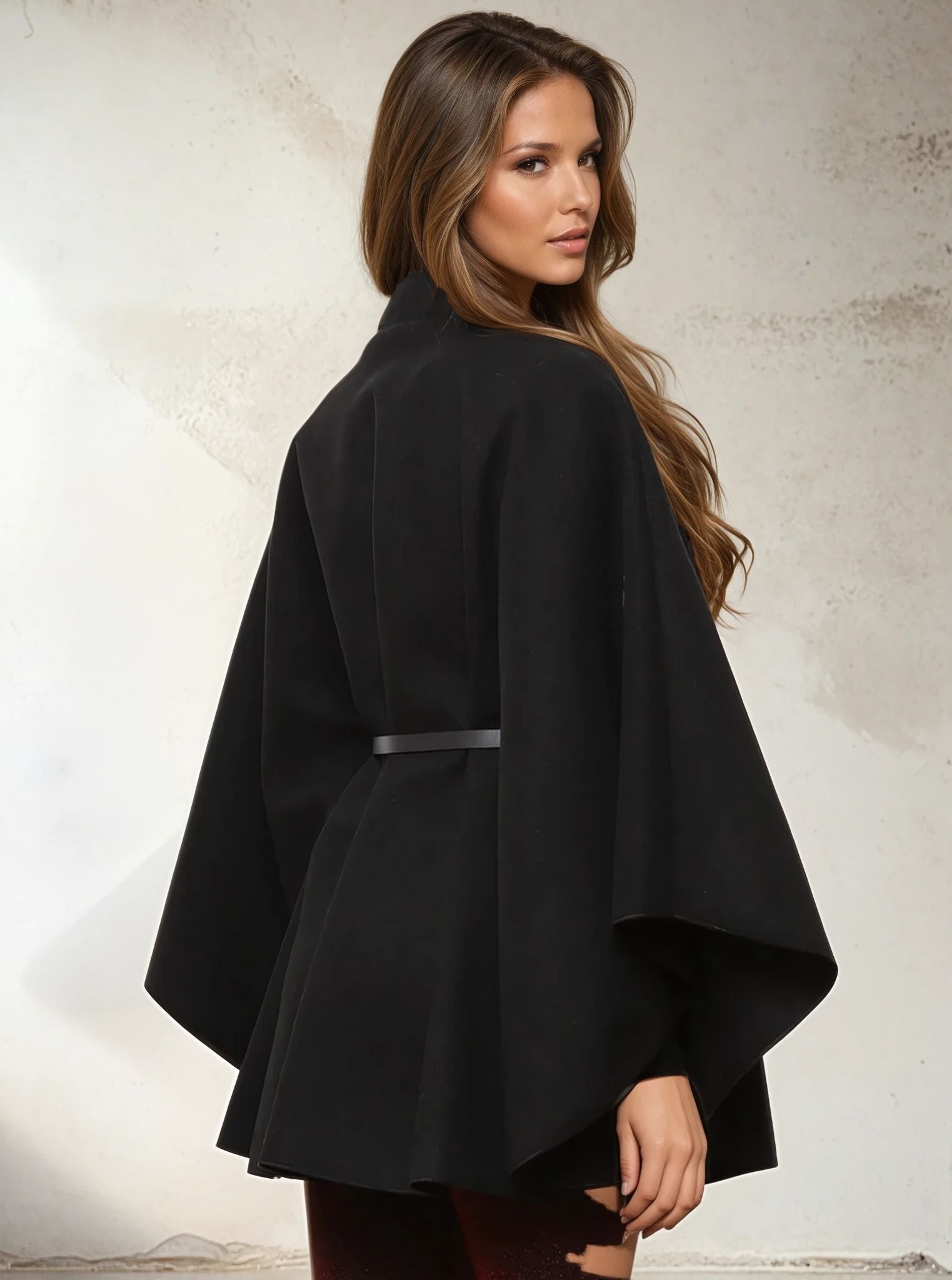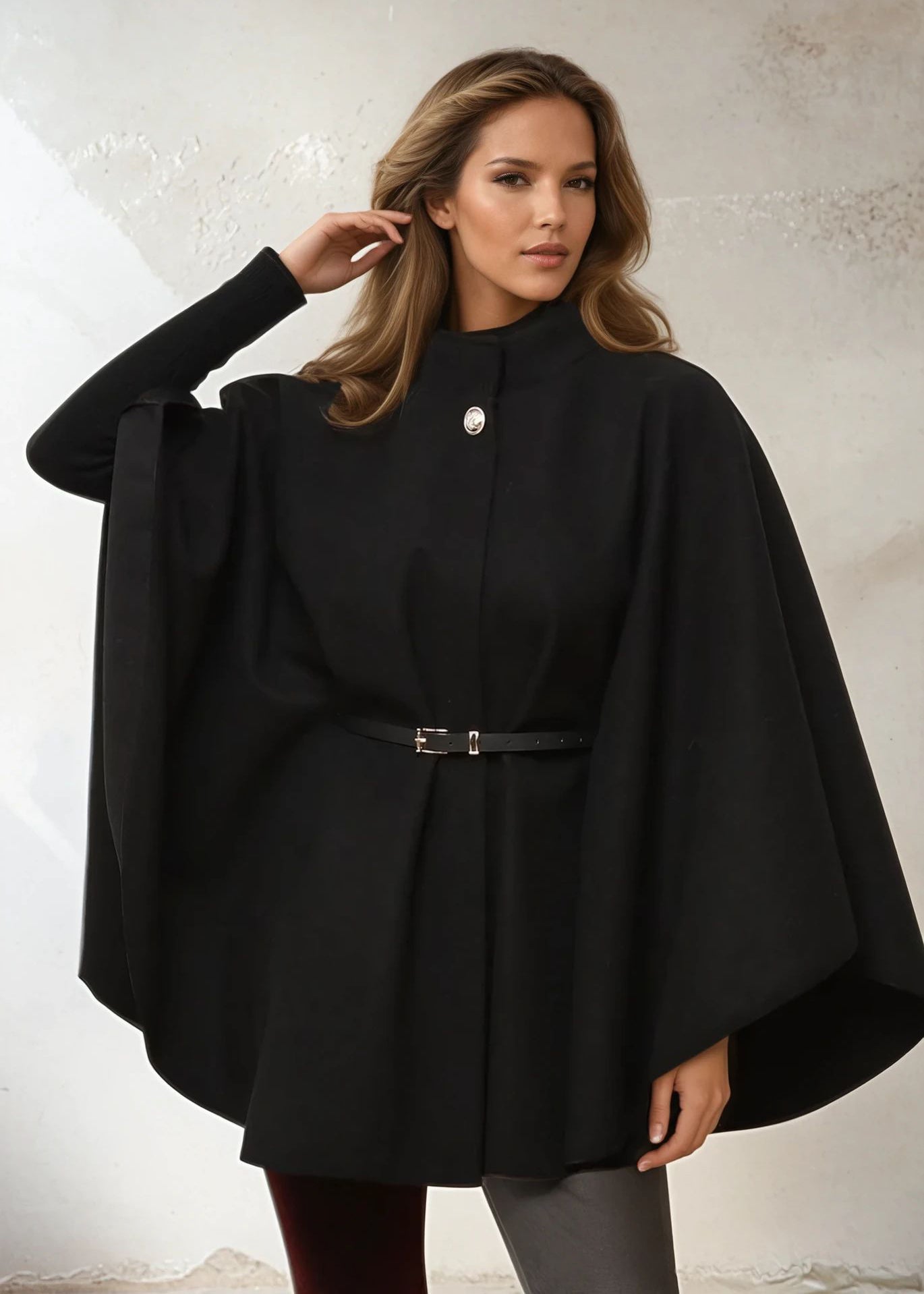 Une veste de cape en polyester élégante et intemporelle, conçue avec la taille dans la taille qui donne une silhouette flatteuse. Parfait pour l'automne, car il combine la chaleur et le style d'une manière détendue mais sophistiquée. Fabriqué en Italie, pour ceux qui recherchent un look chic et confortable.