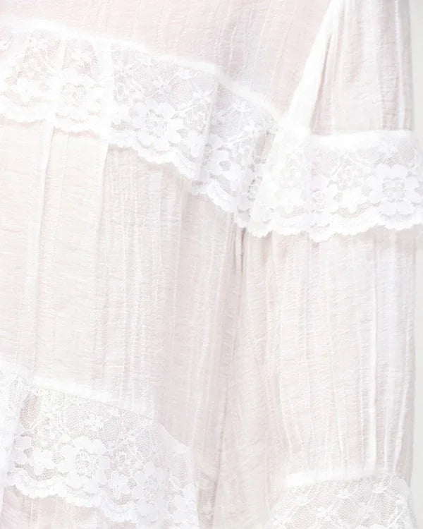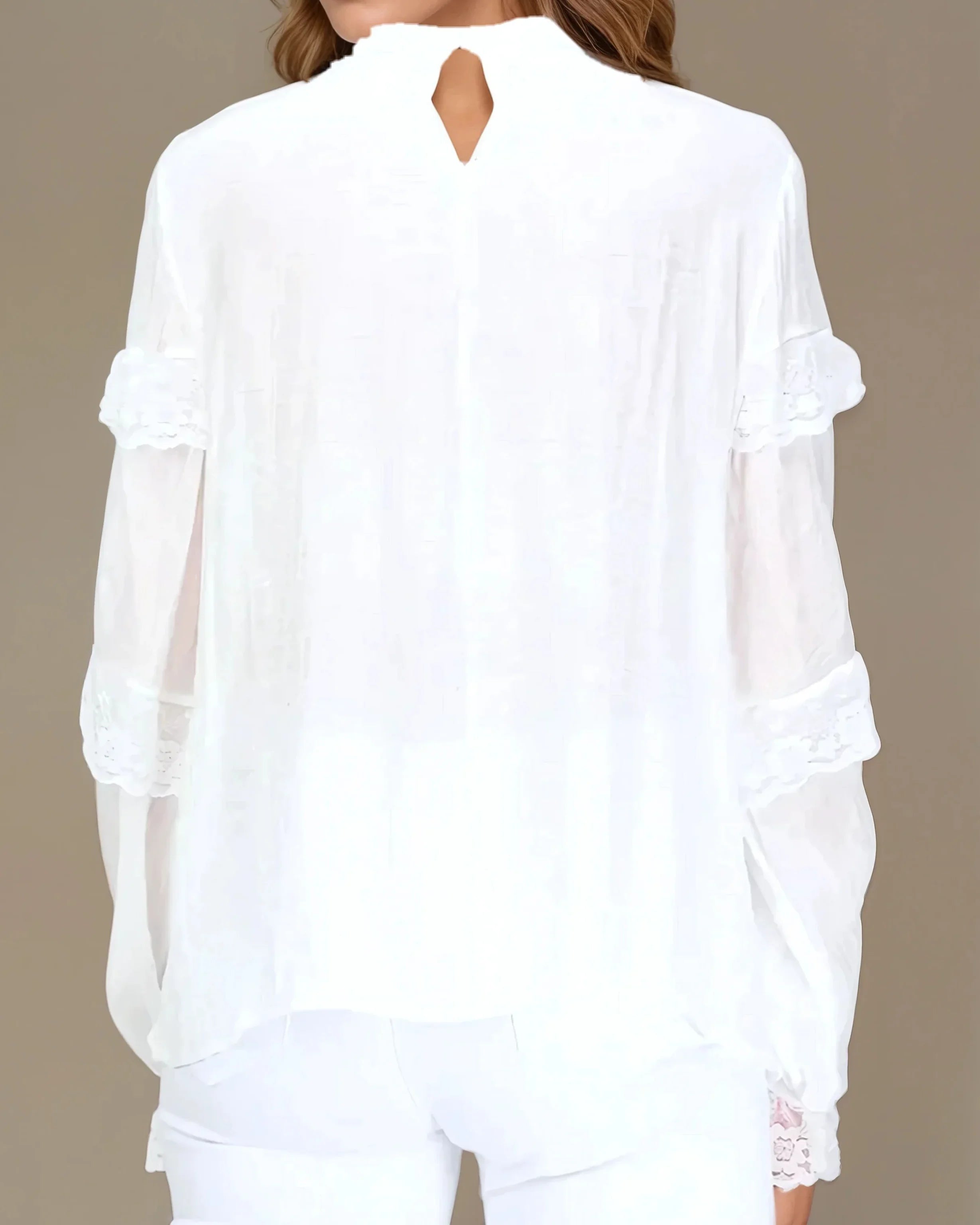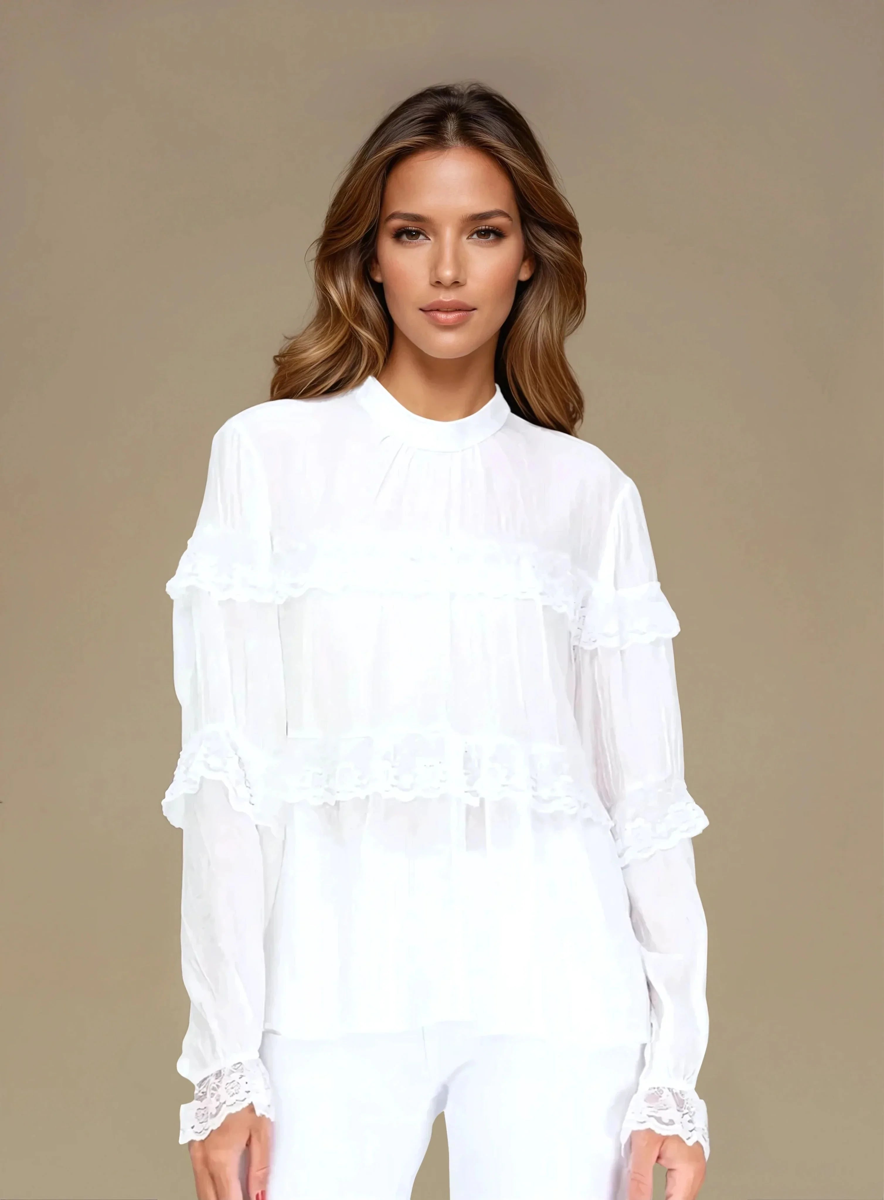 Créer un look romantique et sophistiqué Avec Chemisier blanc avec Détails plissés et dentelle. Le design élégant en combine un Ajustement aéré Avec de beaux éléments en dentelle, qui donne un style féminin et classique.