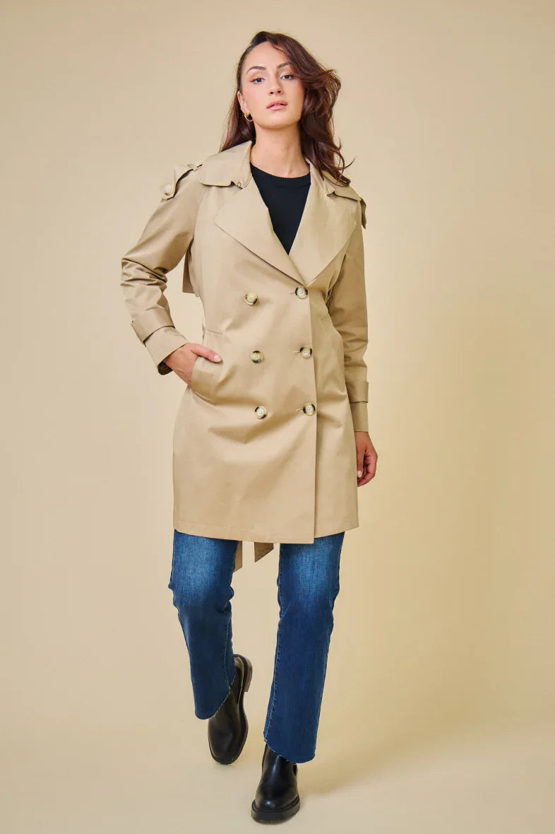 Gardez le style quel que soit le temps avec ce trench beige classique. Fabriqué dans un matériau hydrofuge, il protège contre les averses de pluie inattendues tout en fournissant une impression intemporelle. La coupe droite et la ceinture réglable à la taille accentuent la figure de manière flatteuse. Avec un collier élégant, une fermeture de bouton et des poches latérales pratiques, ce trench-coat est à la fois fonctionnel et élégant. Idéal pour les saisons de transition ou comme couche pendant les jours froids. Un vêtement polyvalent qui s'adapte à la fois tous les jours et plus formels.
