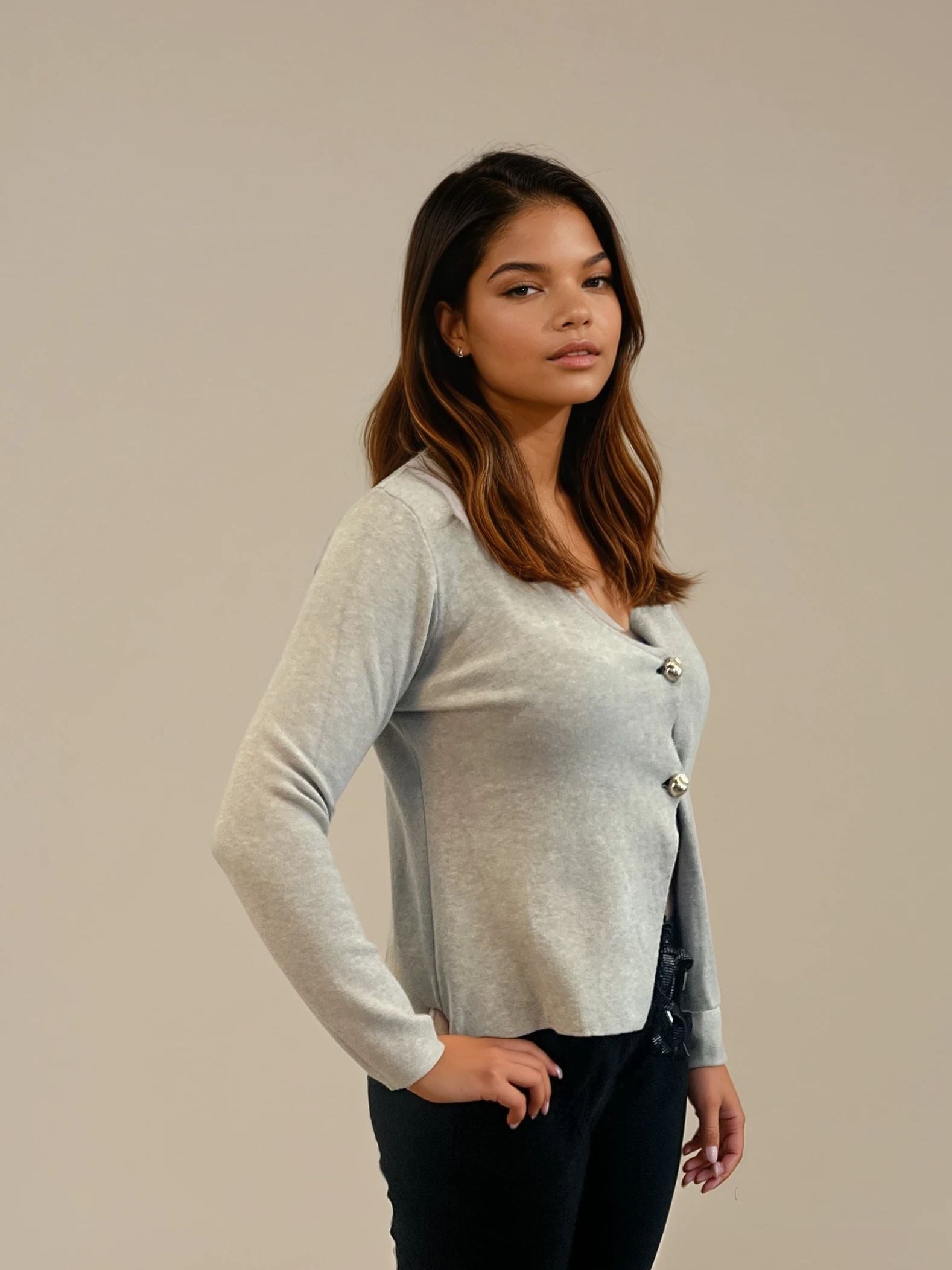 🤍 Detaljer: Kort modell, V-ringning, två guldknappar, mjukt stickat material