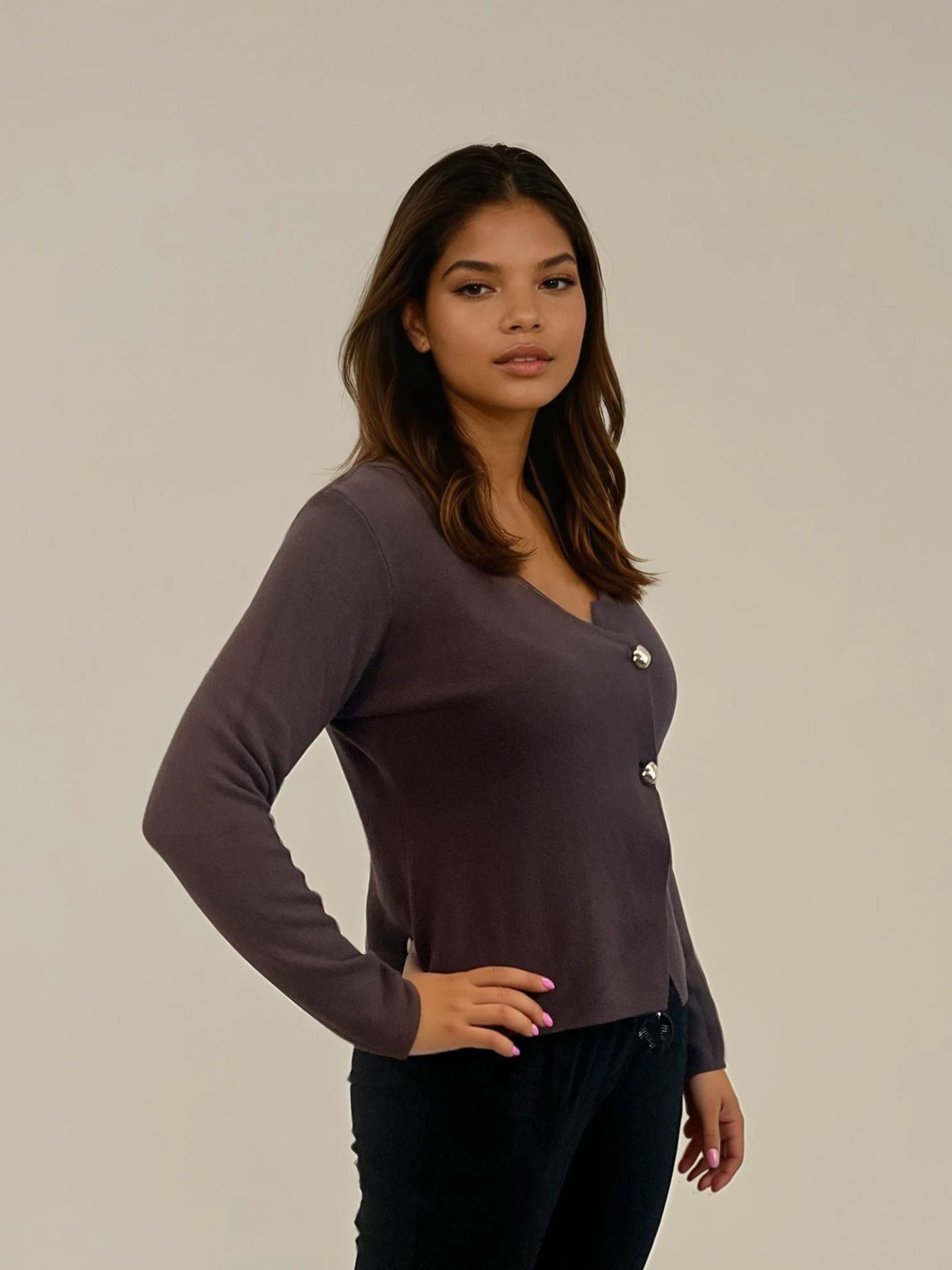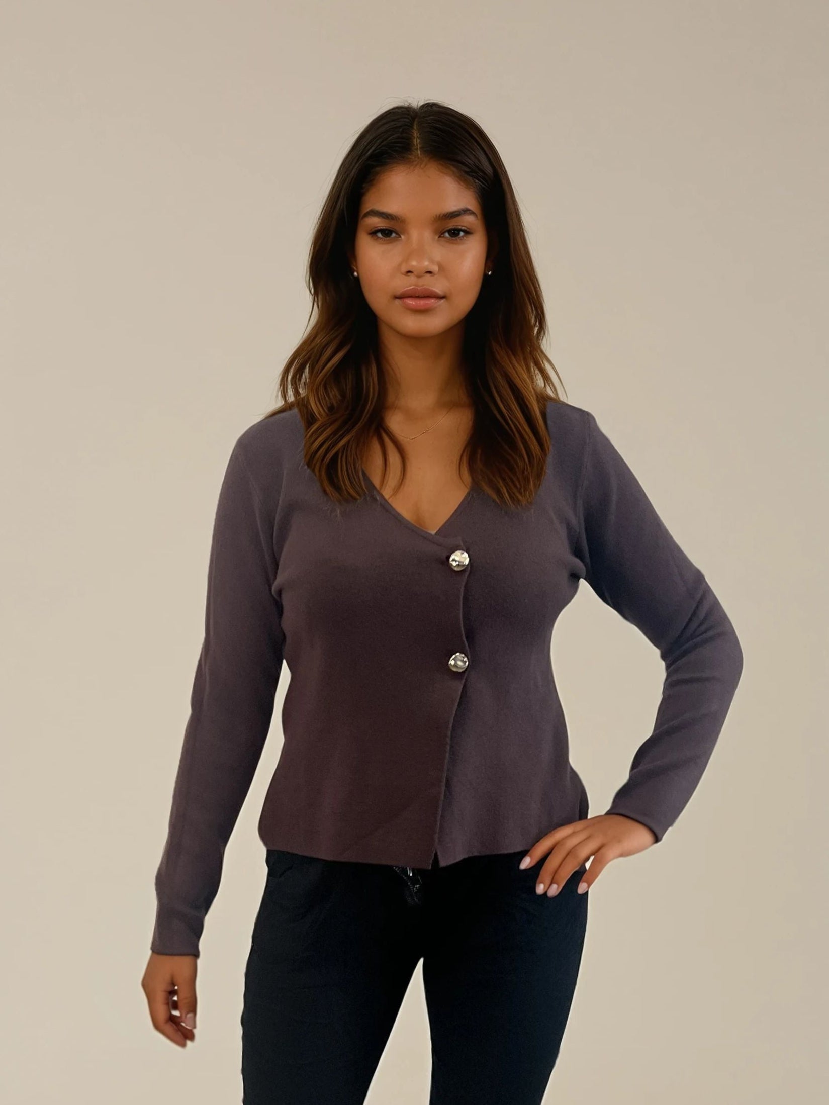 🤍 Detaljer: Kort modell, V-ringning, två guldknappar, mjukt stickat material