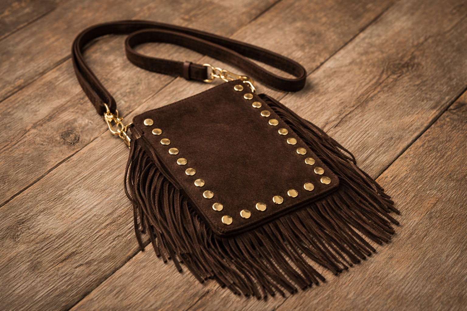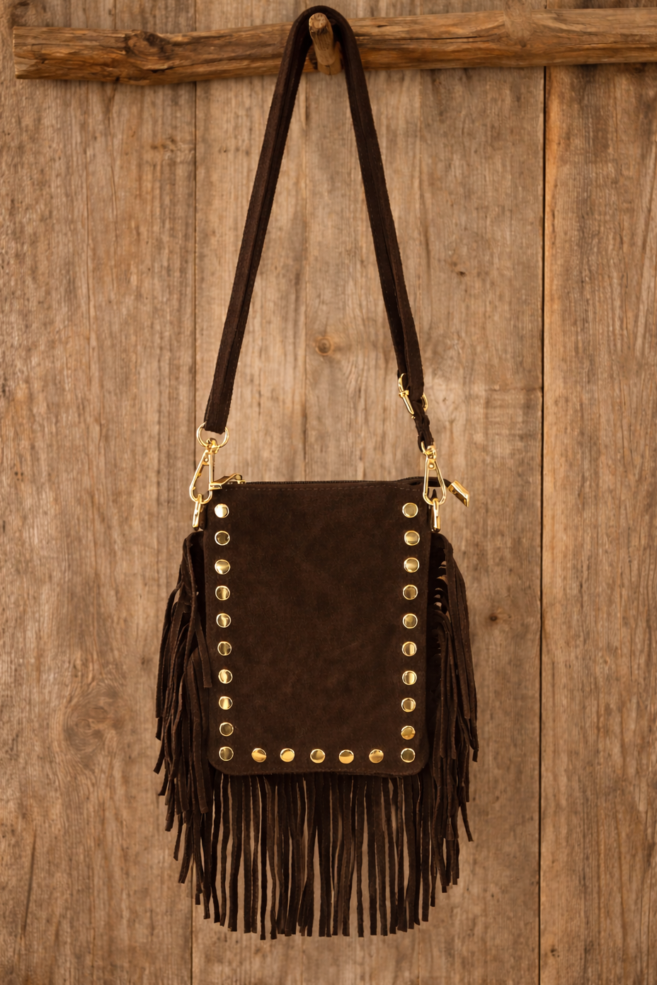 Majken är en trendig och bohemisk crossbody-väska skapad i äkta, mjuk mocka – en kvalitetskänsla som både syns och känns. Den djupa coffeefärgade tonen är en av årets mest efterfrågade nyanser och gör väskan lätt att matcha till allt från vardagsjeans till höstens och vårens stickade favoriter. Med sina dekorativa fransar och läckra gulddetaljer blir Majken ett riktigt statement i din outfit.