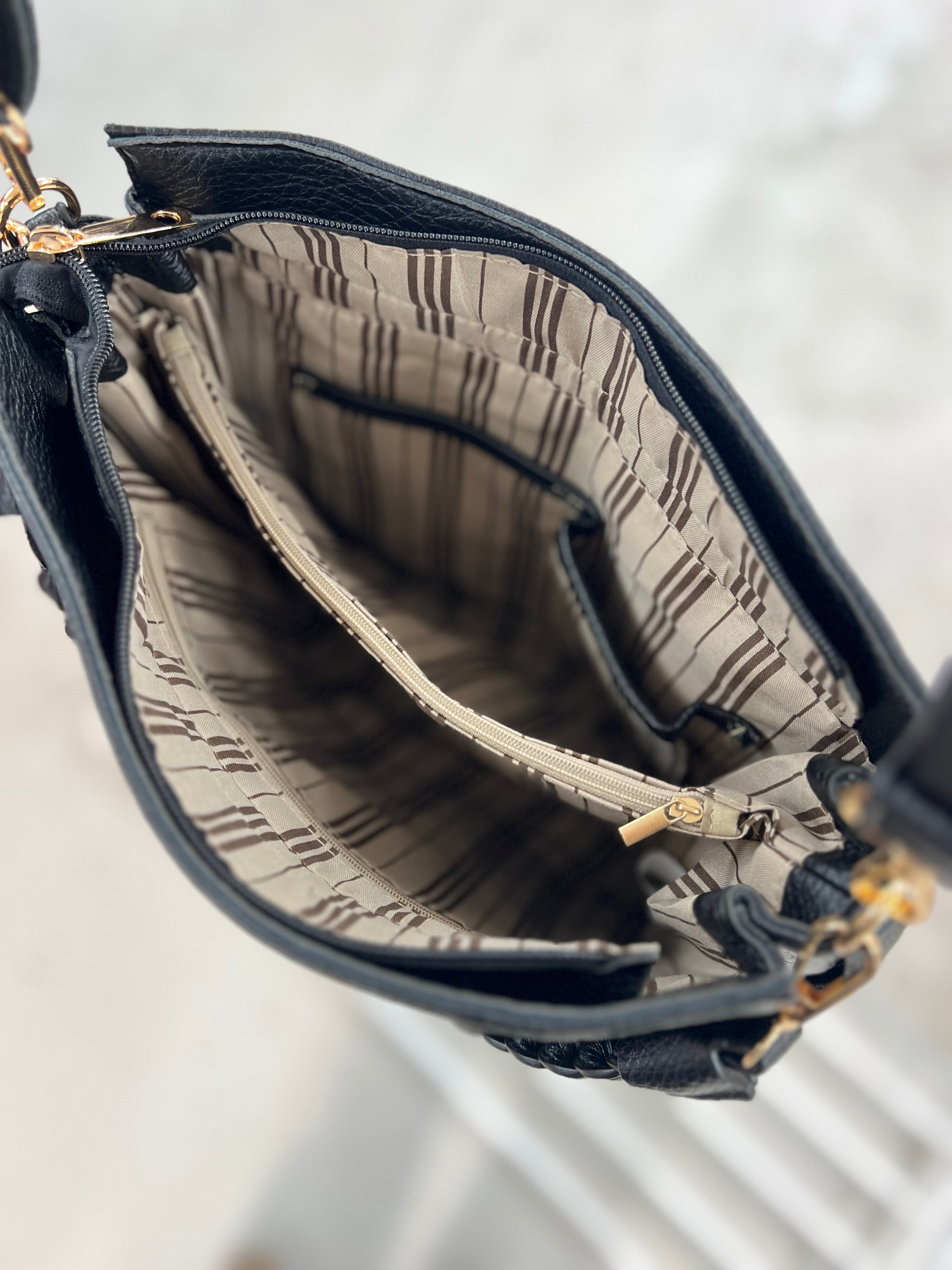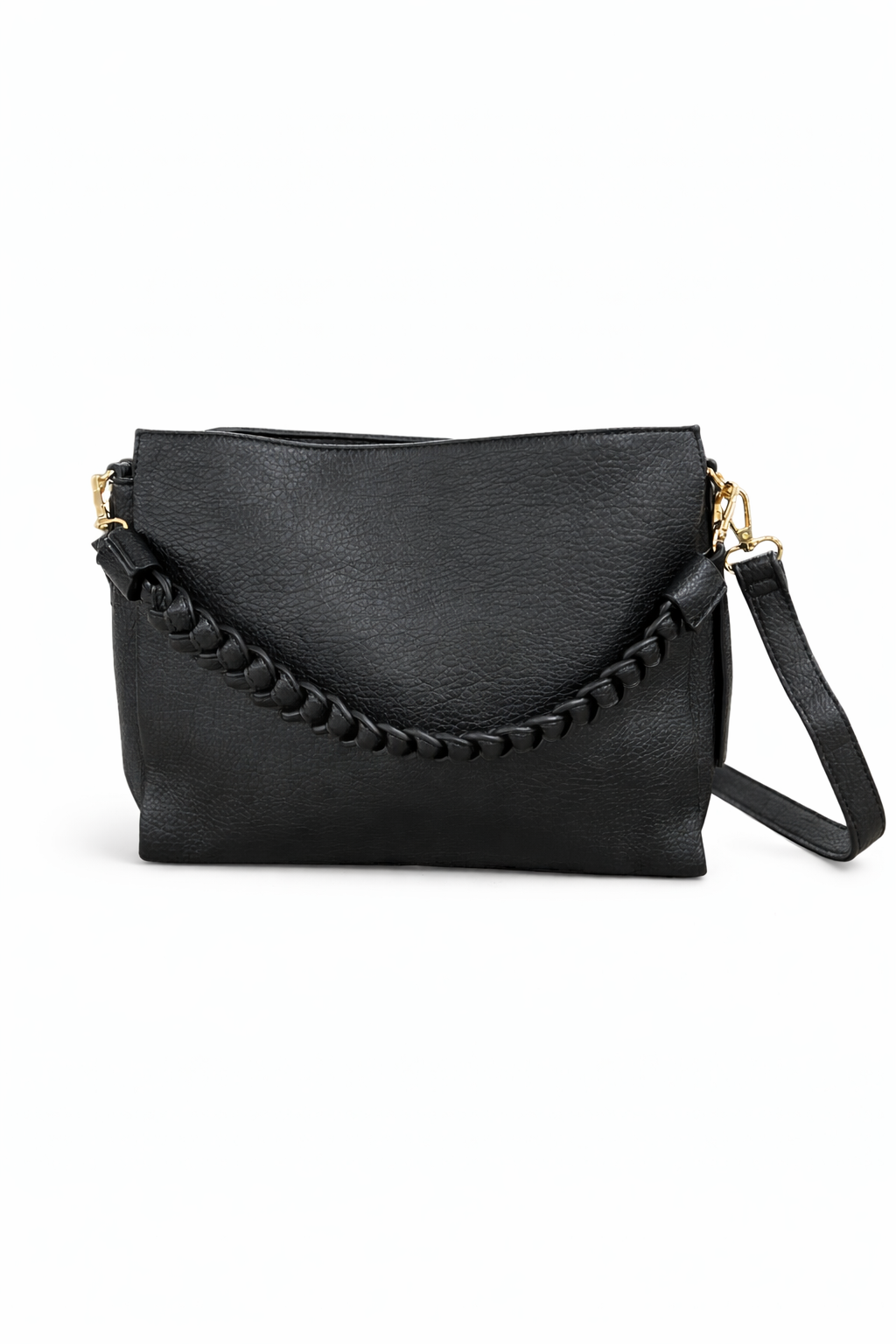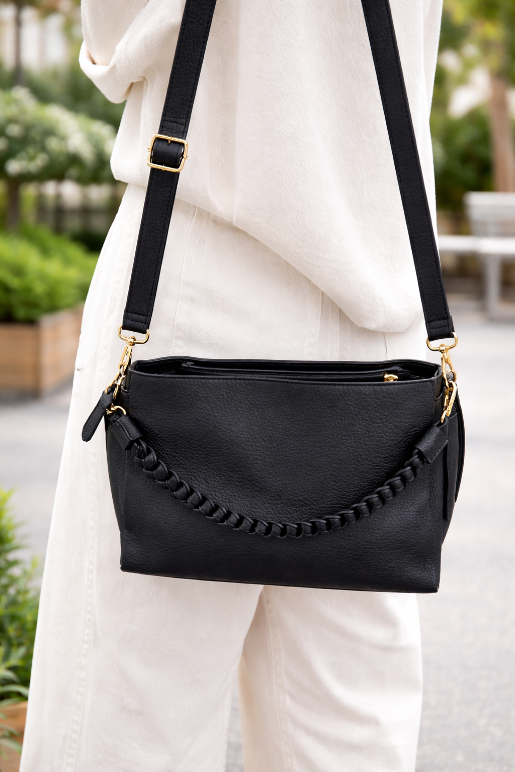 Elegant och tidlös handväska i mjukt, strukturerat svart material som passar alla tillfällen. Väskan har ett dekorativt flätat handtag framtill som ger den en unik och modern look. Den avtagbara och justerbara axelremmen gör att du enkelt kan bära väskan både över axeln och crossbody.