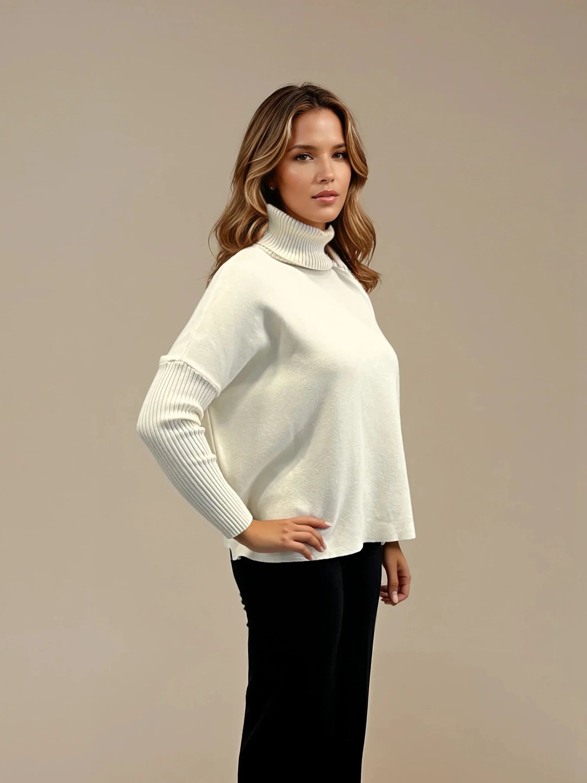 En mjuk och stilren polotröja i oversize-modell med generös passform. Den höga kragen och de ribbstickade ärmarna ger ett tidlöst uttryck som passar både till vardags och mer dressade tillfällen.